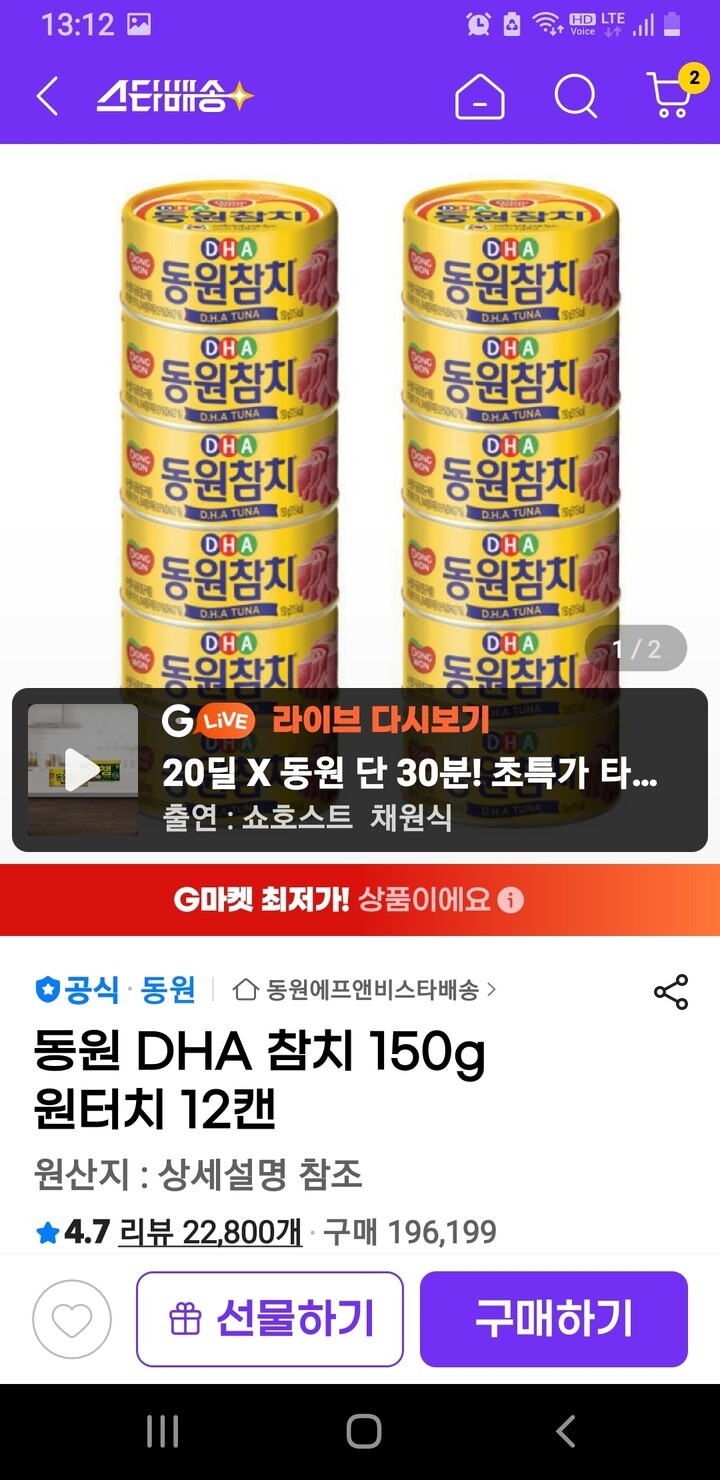 | 동원참치 12캔 잘 받았어요 ~^^ 아들이 맛있게 잘 먹고 있답니다. 참치하면 동원참치 아니겠습니까 ~? ㅎㅎ 좋은 상품 감사합니다 ~^^ | |